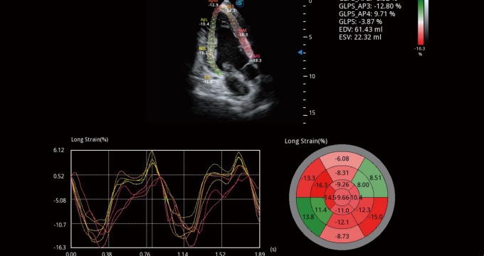 通過(guò)心肌識(shí)別技術(shù)和二維斑點(diǎn)追蹤技術(shù)相結(jié)合,計(jì)算心肌各節(jié)段的應(yīng)變應(yīng)變率、速度、位移并以曲線(xiàn)圖顯示,實(shí)現(xiàn)整體或者局部心肌定量分析。同時(shí)可呈現(xiàn)牛眼圖直觀和準(zhǔn)確診斷心肌的運(yùn)動(dòng)情況。